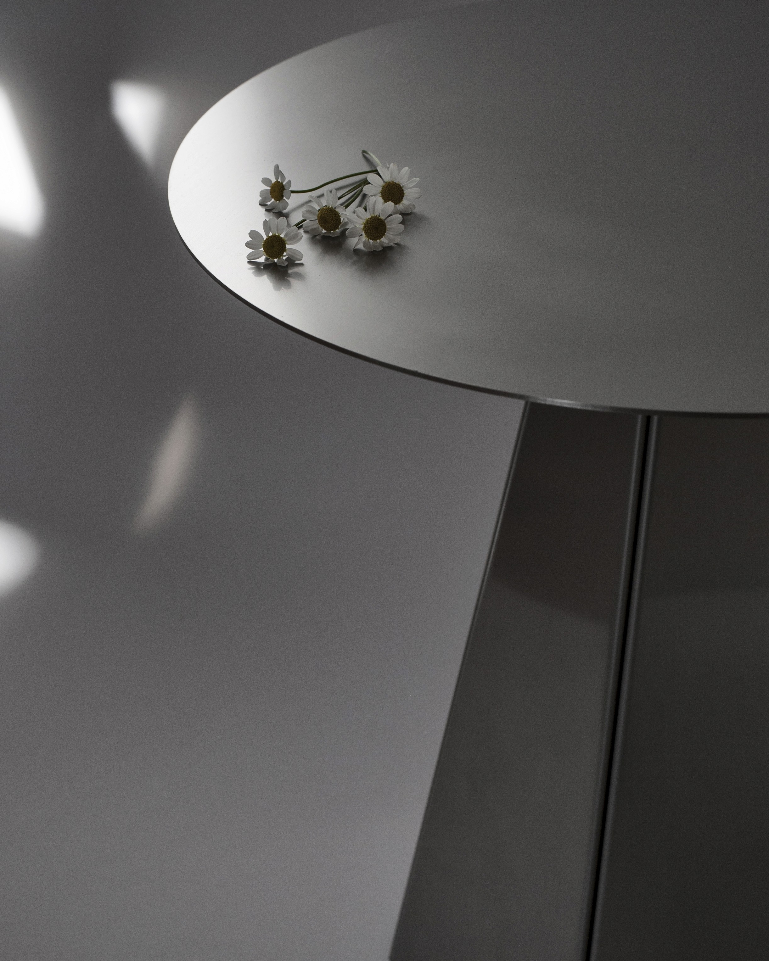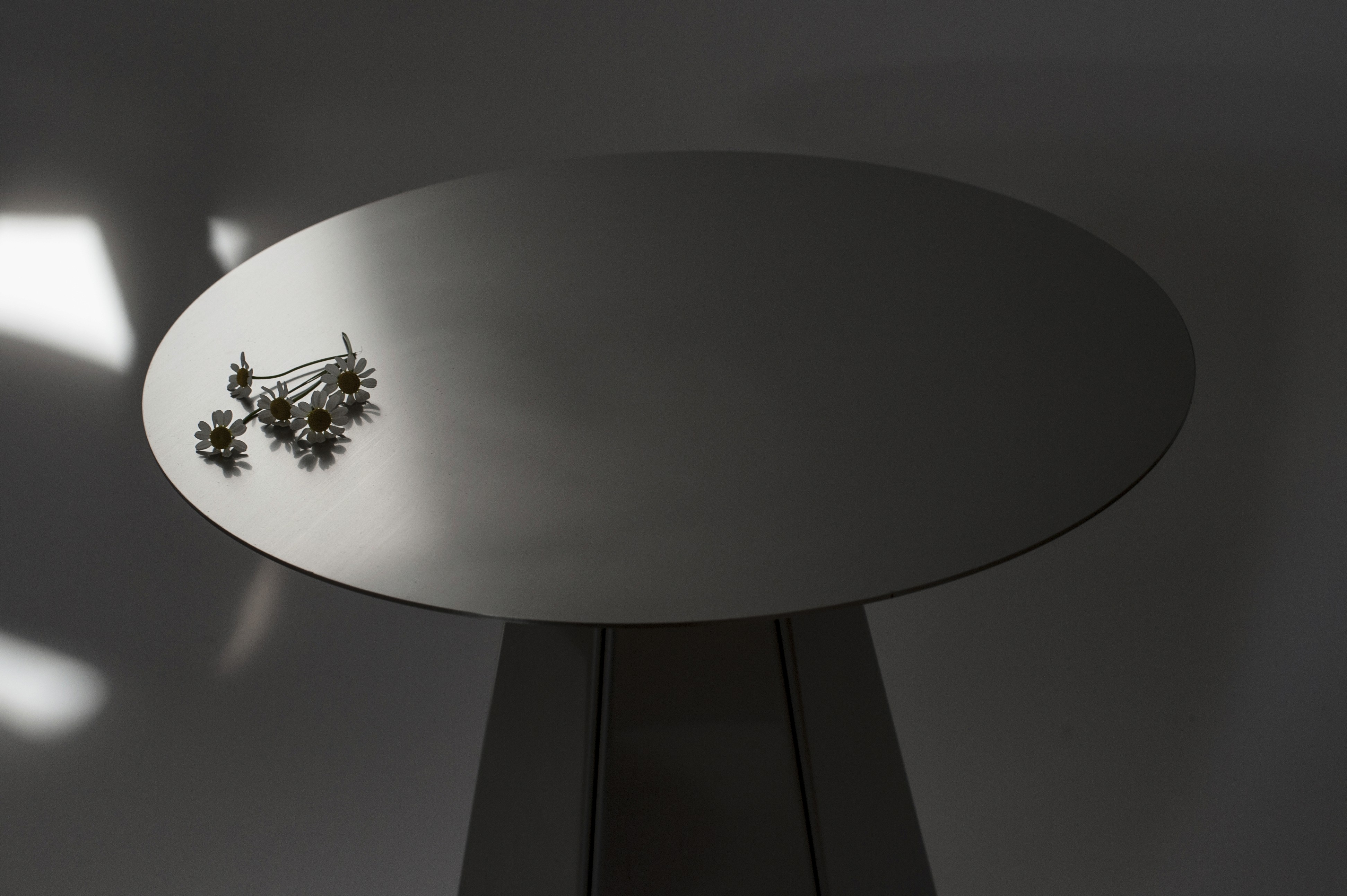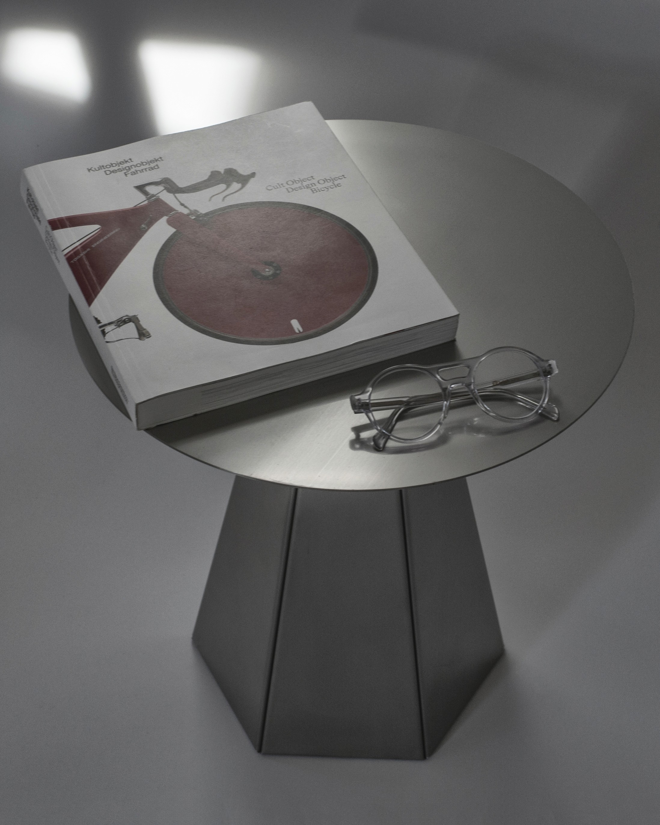 Stalowy stolik pomocniczy. Posiada demontowalny blat. Montowany oraz wykończony ręcznie.