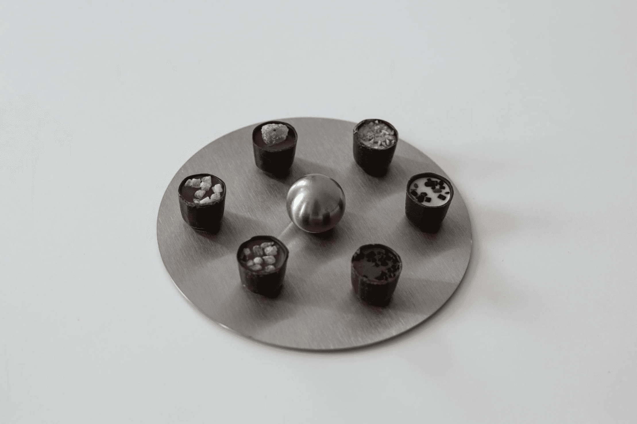 Stalowa patera. Może być stosowana jako taca do serwowania albo ekspozytor do małych przedmiotów. Montowana oraz wykańczana ręcznie.